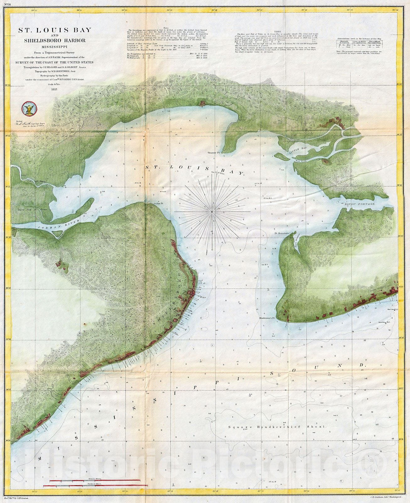 An attractive hand colored 187 U.S. Coast Survey triangulation chart or map of St. Louis Bay, Mississippi. Details the area around St Louis Bay including the town of Shieldsboro (modern St. Louis Bay) and Pass Christian, Mississippi. Details to the level of individual buildings showing many of the wharves and piers in both communities. Shows the Jordan River as well as the Bayou Portage. Square Handkerchief Shoal is noted. Depth soundings throughout. The hand color work on this beautiful map is exceptionally well done. The triangulation for this map was completed by J. E. Hilgard and S. A. Gilbert. The topography was accomplished by W. Greenwell. The hydrography is the work of a party under the command of B. F. Sands. This map was compiled under the direction of A. D. Bache, Superintendent of the Survey of the Coast of the United States and one of the most influential American cartographers of the 19th century.