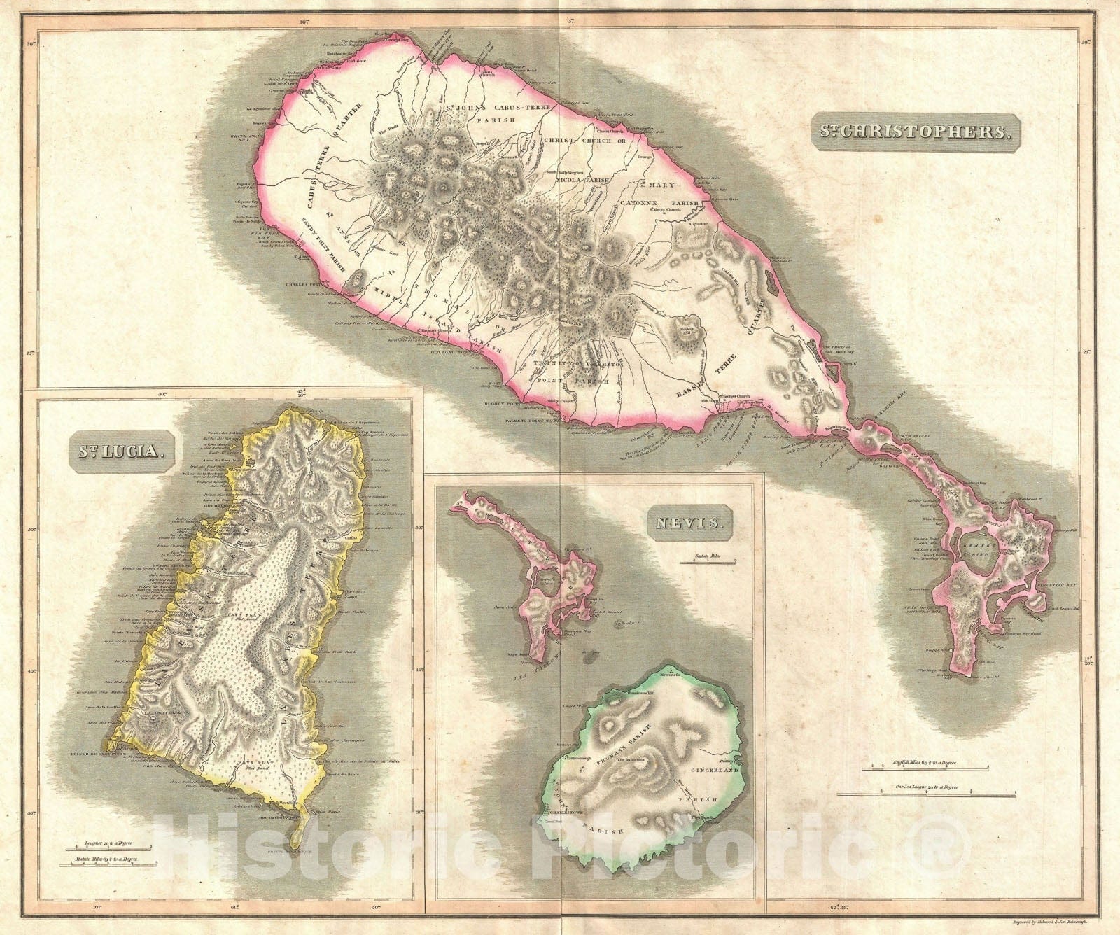Historic Map : West Indies Islands: St. Christophers, St. Lucia, & Nevis, Thomson, 1814, Vintage Wall Art