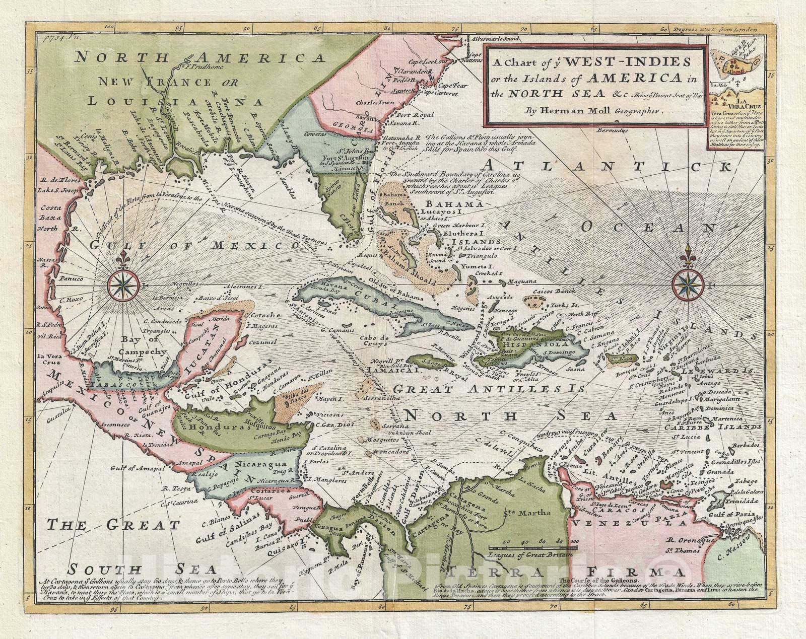 The West Indies w/Galleon Routes, Hermann Moll, 1745