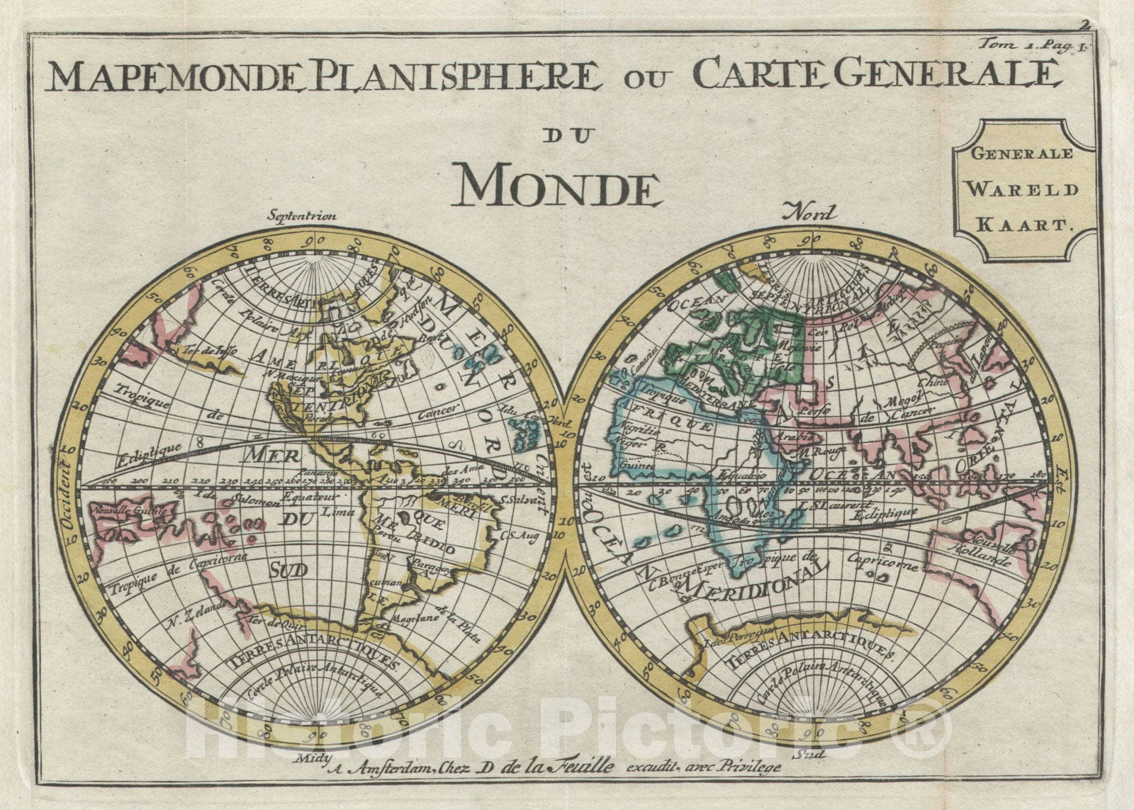 • .Historic Map : The World on Hemisphere Projection, de La Feuille, 1706, Vintage Wall Art
