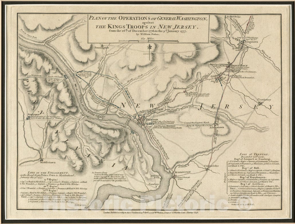 This map depicts events of the New Jersey campaign, from December 26, 1776 to January 3, 1777, during the American Revolutionary War. Led by General George Washington, the map illustrates the American's famous crossing of the Delaware River from Trenton, NJ into Pennsylvania on December 25th. Washington attacked the Hessian garrison at Trenton at dawn on December 26th, which resulted in an American victory. This map details the number of British and Hessian losses in the lower left and right columns, along with the routes taken by the American troops en route to Trenton, and the action there.