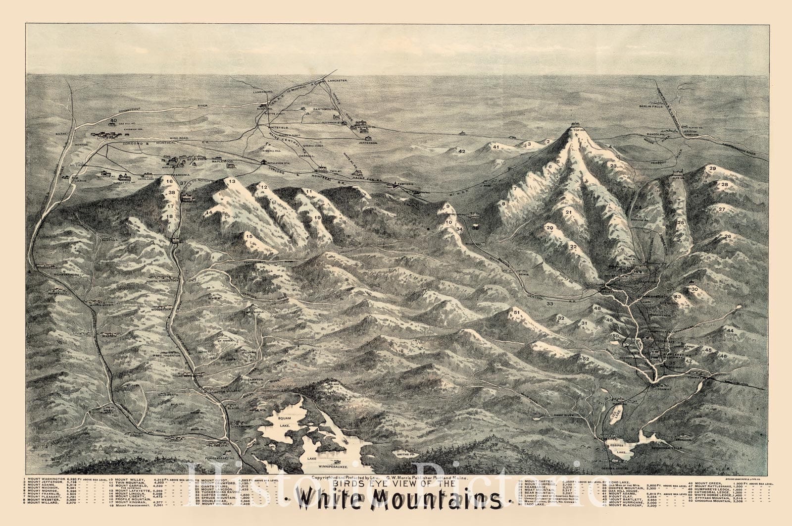 Historical Map, 1890 Birds eye view of the White Mountains, Vintage Wall Art