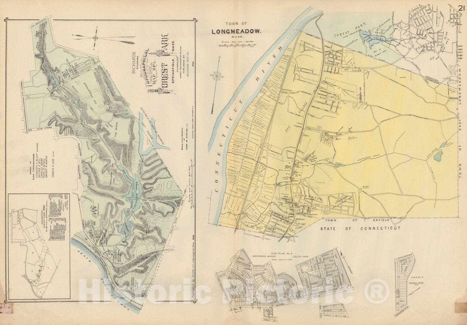 • Historic Map : Atlas City of Springfield and the Town of Longmeadow, Longmeadow & Springfield 1920 Plate 021 , Vintage Wall Art