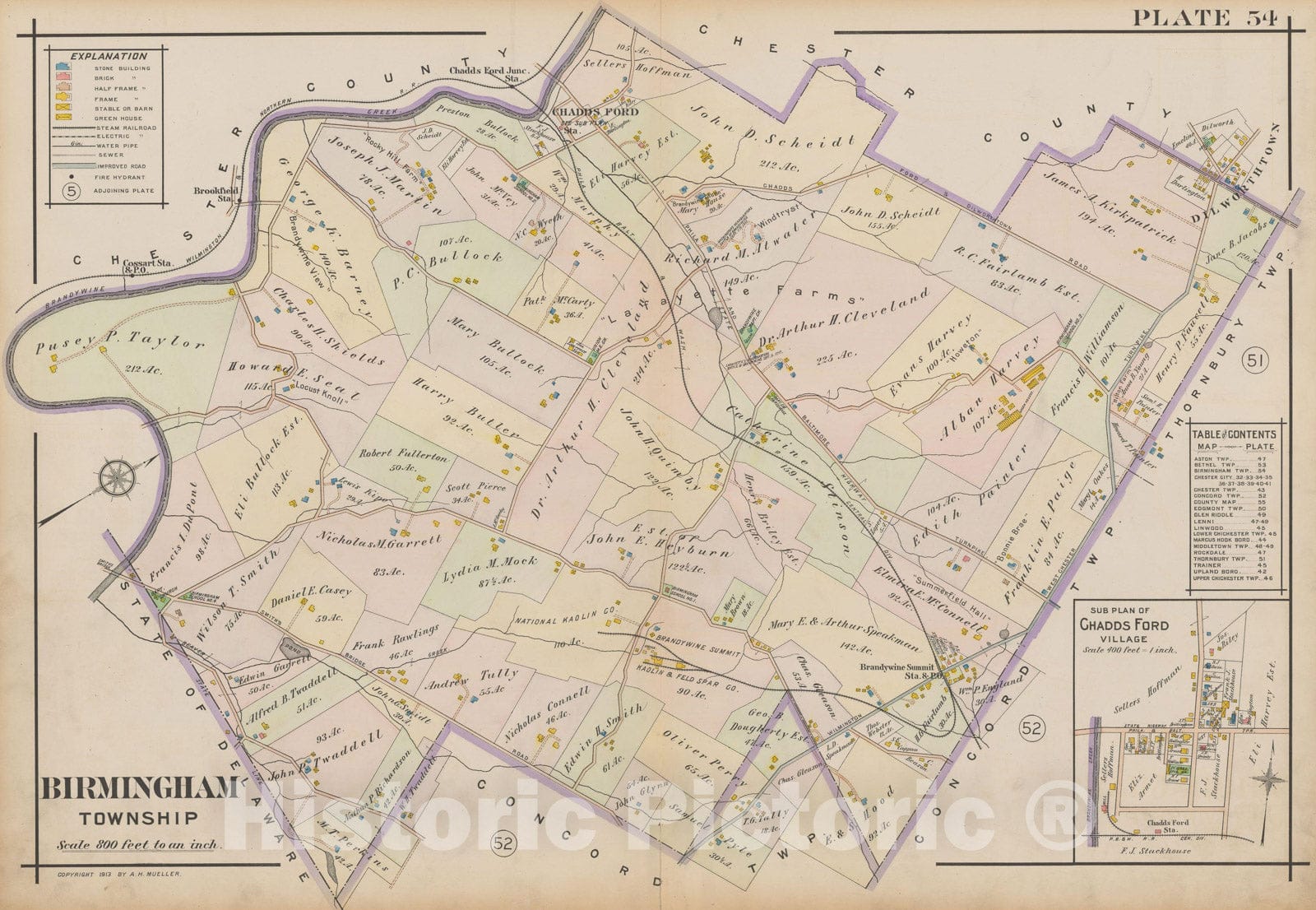 • .Historic Map : Atlas of Delaware County, West of Ridley Creek, Vol. Two, Birmingham 1913 Plate 054 , Vintage Wall Art