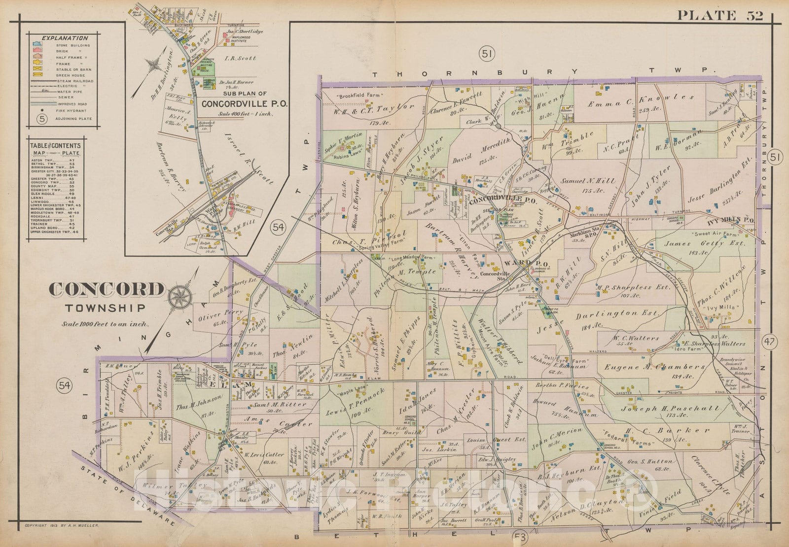 Historic Map : Atlas of Delaware County, West of Ridley Creek, Vol. Two, Concord 1913 Plate 052 , Vintage Wall Art