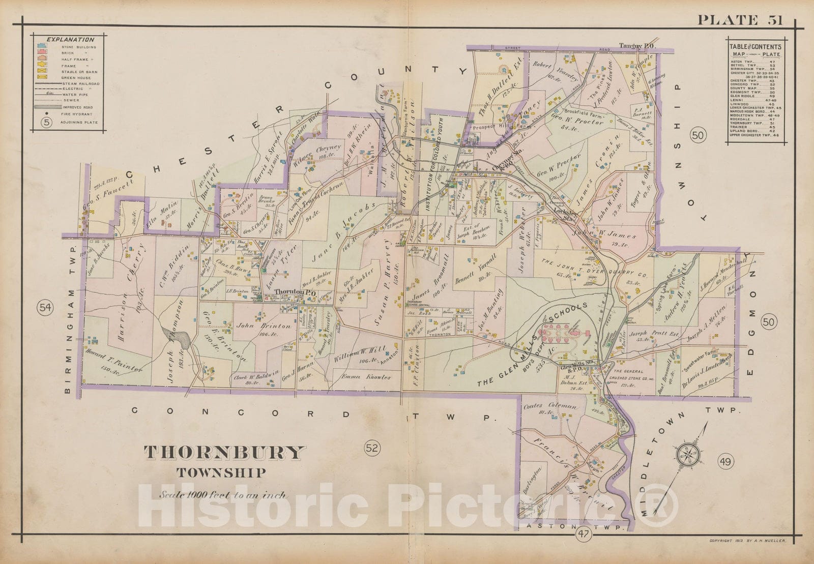 Historic Map : Atlas of Delaware County, West of Ridley Creek, Vol. Two, Thornbury 1913 Plate 051 , Vintage Wall Art
