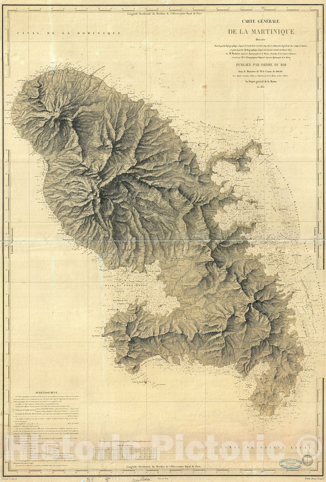 A beautiful French nautical chart or map of Martinique issued in 1831 by the Depot de la Marine. Offers sumptuous detail both inland at sea. There are countess depth soundings as well as notes on undersea features such as banks and shoals. Equally impressive detail inland with beautifully engraved topography throughout. Today Martinique, with its French Caribbean culture, lush rainforests, and stunning beaches is considered a jewel of the Caribbean. Issued by M. Monnier and M. Le Bourguignon-Duperre for the Depot-general de la Marine in 1831.
