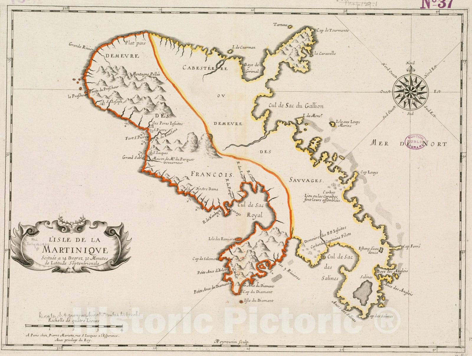 Historical Map, 1656 L'isle de la Martinique : scituee a 14 degrez 30 Minutes de Latitude septentrionale, Vintage Wall Art