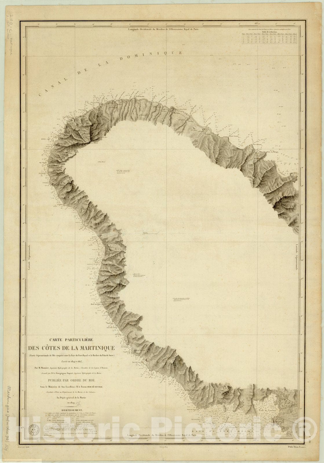 Carte particuliere es Co?tes de la Martinique : (Partie Septentrionale de l'I?le comprise entre la Baie du Fort Royal et le Rocher du Pain de Sucre) Levee en 1824 et 1825 / Par M. Monnier ; Seconde par M. Le Bourguignon Duperre ; Grave par Caplin