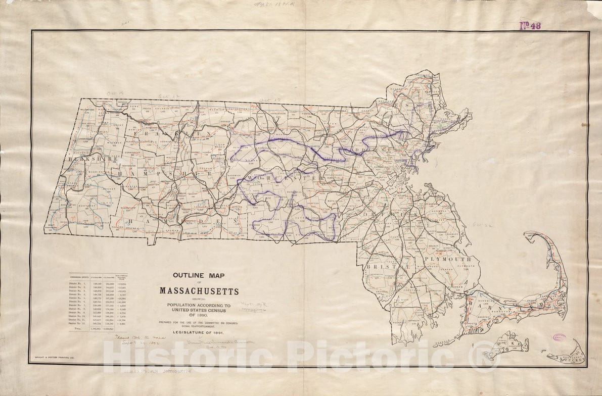 Historical Map, Outline map of Massachusetts showing population according to the United States census of 1890, Vintage Wall Art