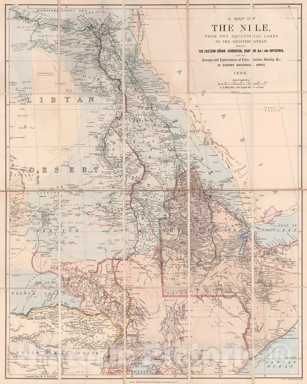 Vintage Map | 1898 A Map of the Nile from the Equatorial Lakes to the Mediterranean | Stanford, Edward