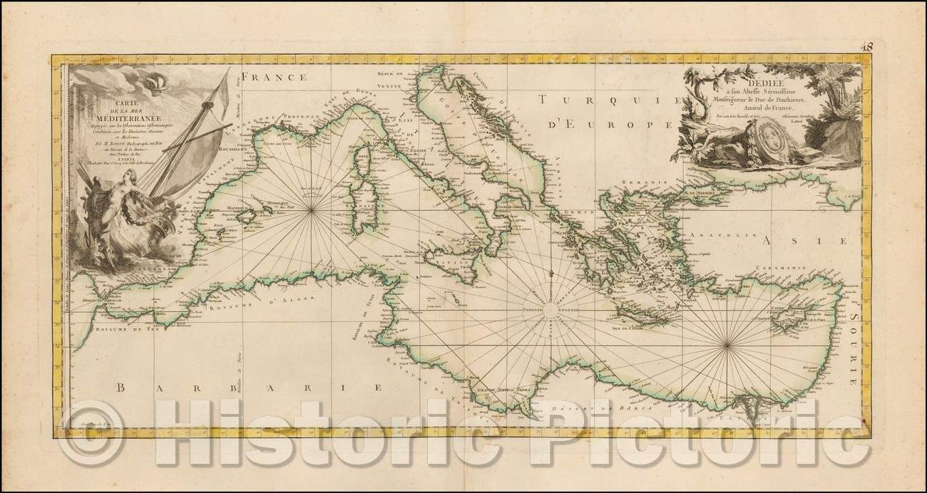 Historic Map - Carte de la Mer M?iterran? Appuy? sur les Observations Astronomiques Combin?/Sea Chart of the Mediterranean Sea, 1780, Rigobert Bonne - Vintage Wall Art