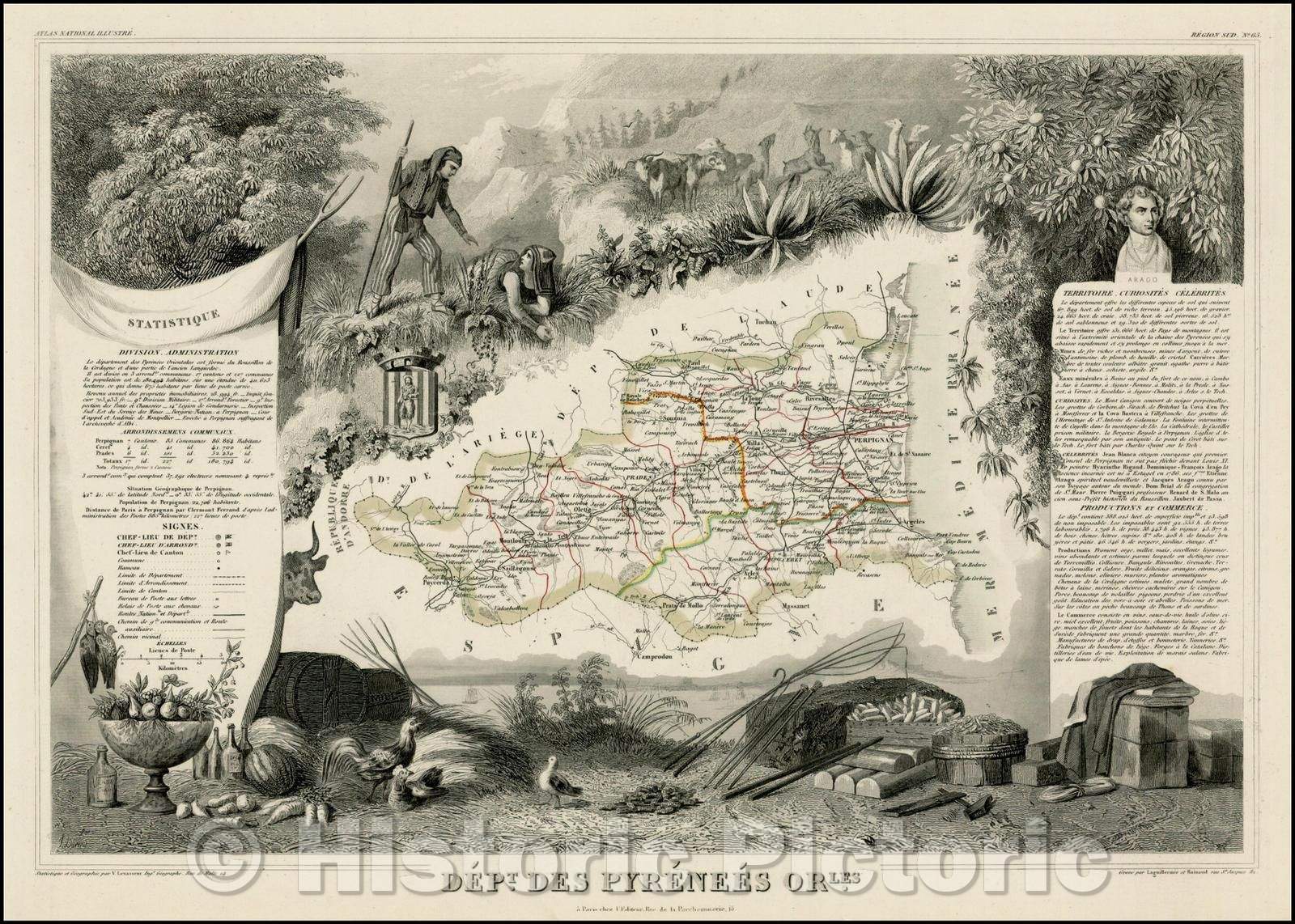 Historic Map - Dept. Des Pyrenees Orles/Map of French Pyrenees, bordering on Spain and the Mediterranean, 1845, Victor Levasseur - Vintage Wall Art