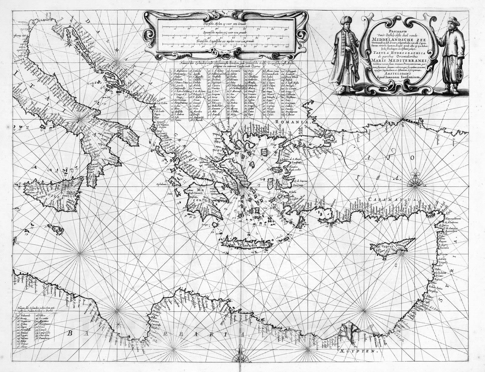 • Historic Map : Eastern Mediterranean Sea 1650 Pascaarte Middelandsche Zee, Tabula Hydrographica, Maris Mediterranei. v2 , Vintage Wall Art