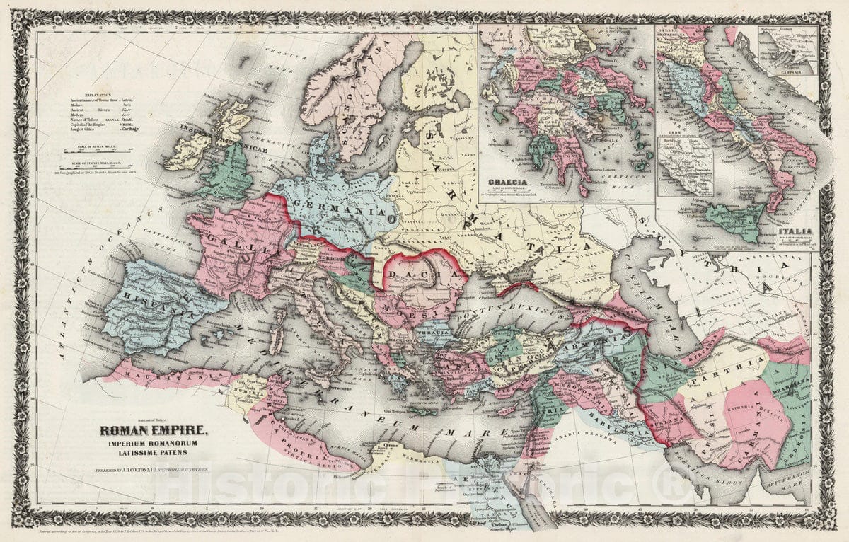 Historic Map : Greece; Italy, Mediterranean, Europe 1858 Roman Empire. , Vintage Wall Art
