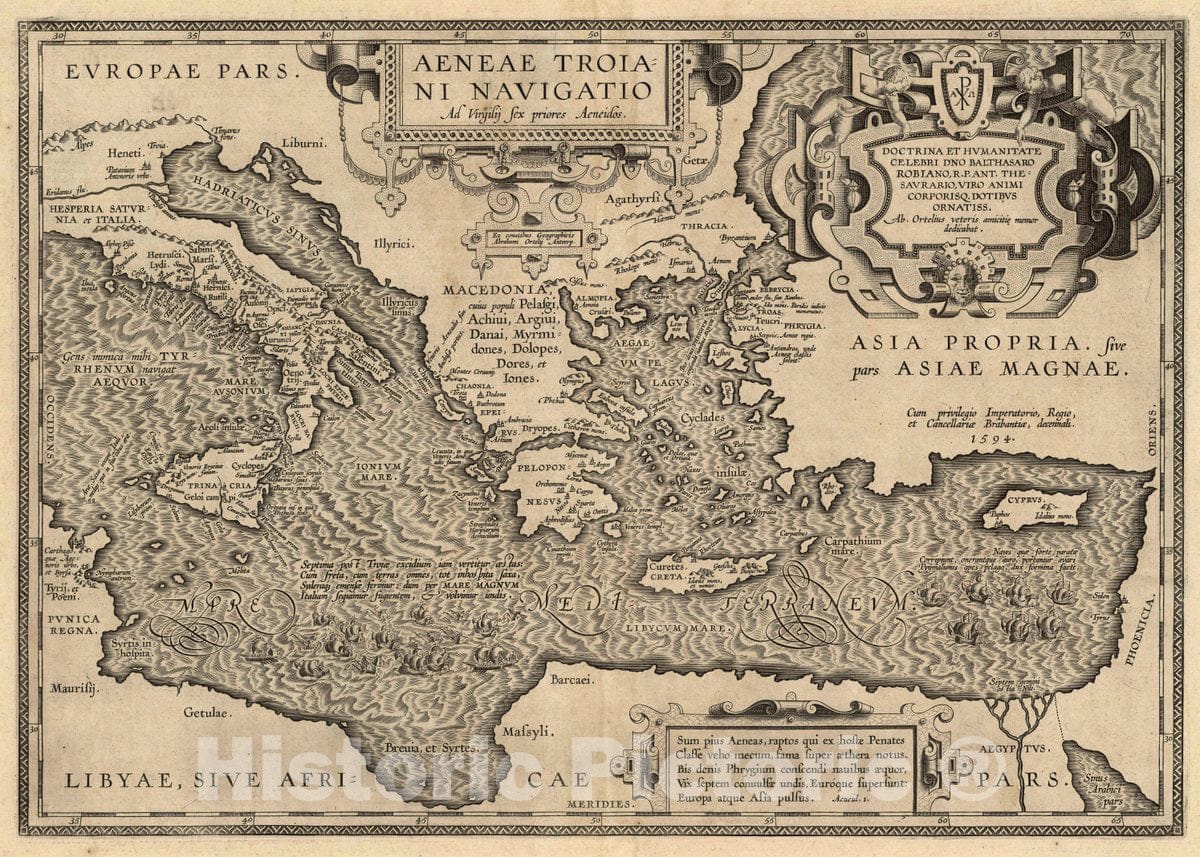 • .Historic Map : Greece, Mediterranean (xxxv) Aeneae Troiani Navigatio, 1594 Atlas , Vintage Wall Art