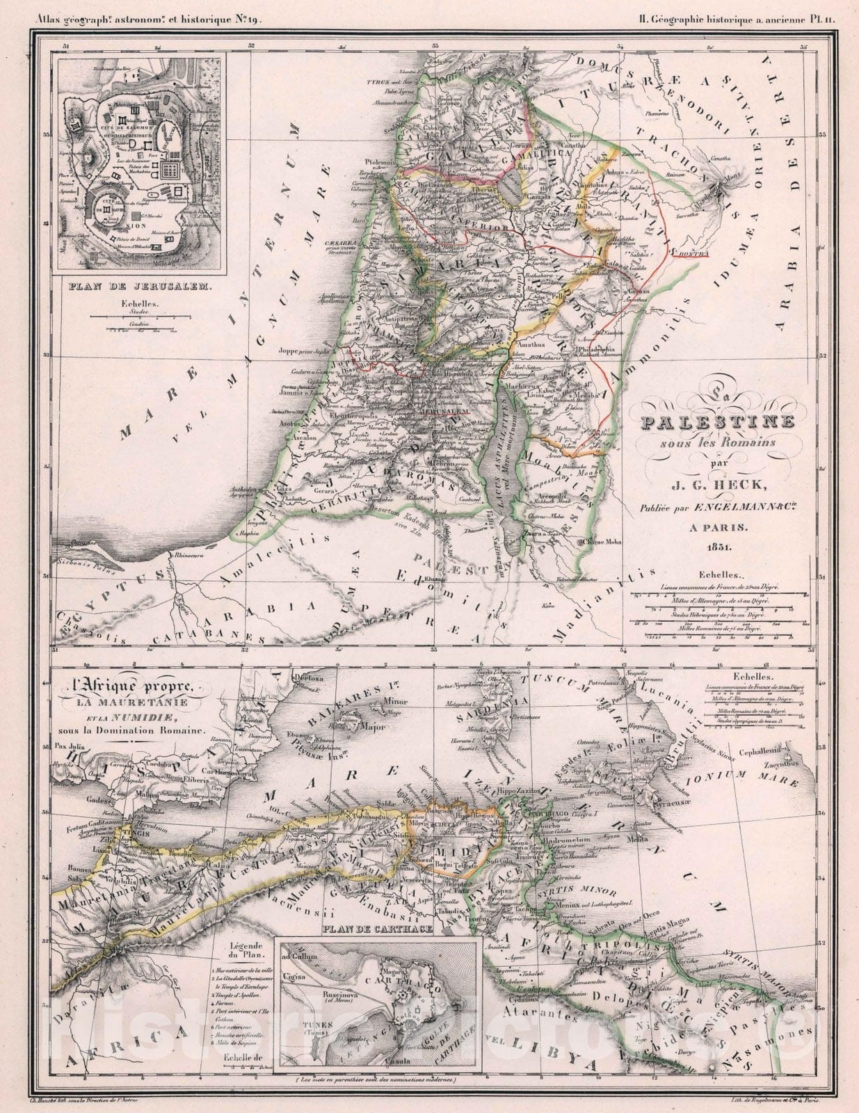 19. La Palestine sous les Romains. l'Afrique propre, la Mauretanie. | Atlas geographique, astronomique et historique, servant a l'intelligence de l'histoire ancienne, du moyen age et moderne et a la lecture des voyages les plus recens. Dresse d'apres les meilleurs materiaux tant francais qu'etrangers conformement aus progres de la science, par J.G. Heck. - Paris, Engelmann & Compagnie, S.F. | Johann Georg Heck was a German bookseller and publisher, lithographer, cartographer, geographer and author. He became known through his work the Illustrated atlas for Conversations lexicon, Iconographic Encyclopaedia of Sciences and Arts, one of the largest German view works of the 19th century (see our copy). This atlas Geographique.. is his only known atlas. In the atlas, his thematic maps are especially noteworthy. Relief shown with hachures. Outline color.