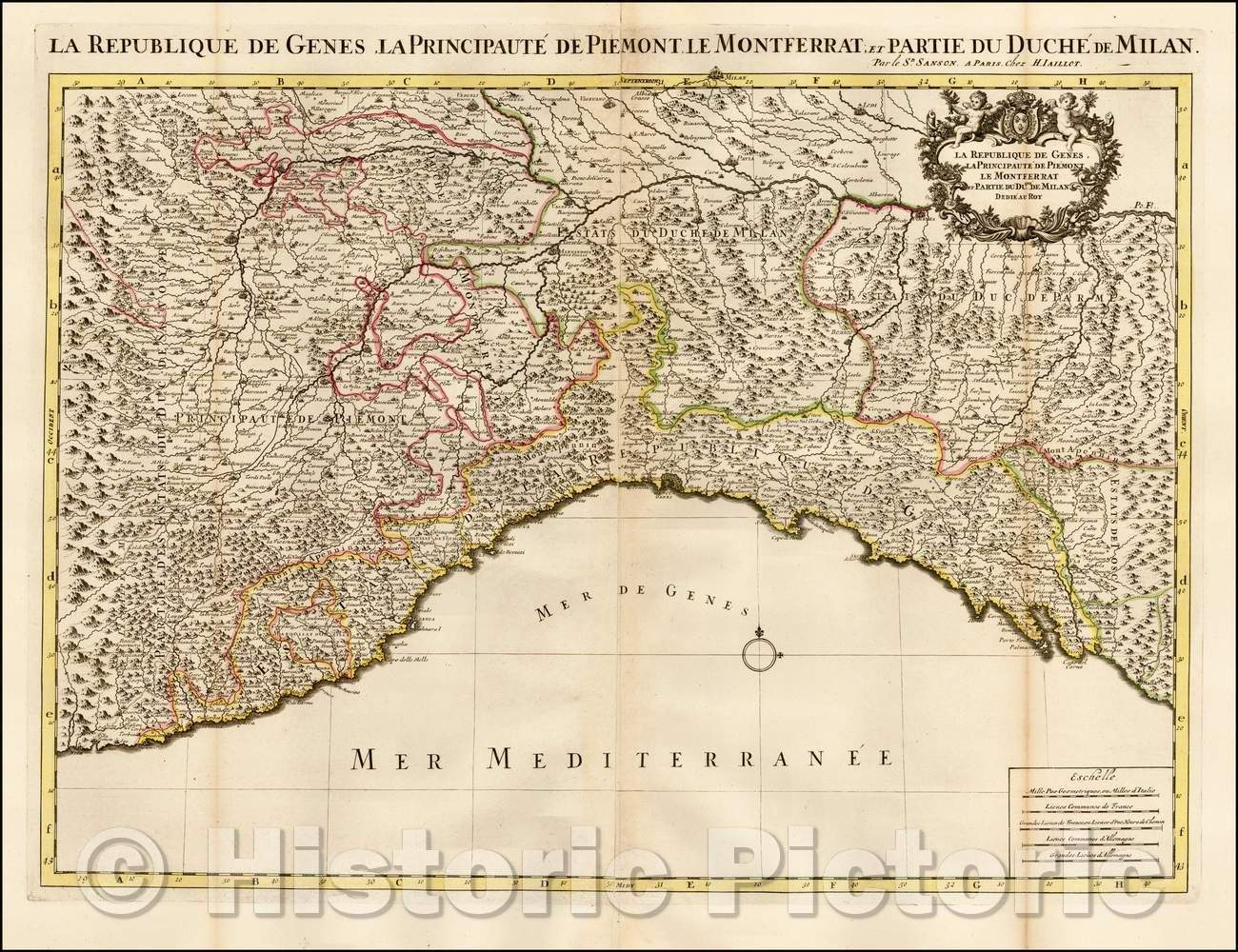 Historic Map - La Republique De Genes, La Principaute de Piemont/Map of the Italian Mediterranean Coast and extending north to Milan, 1695 - Vintage Wall Art