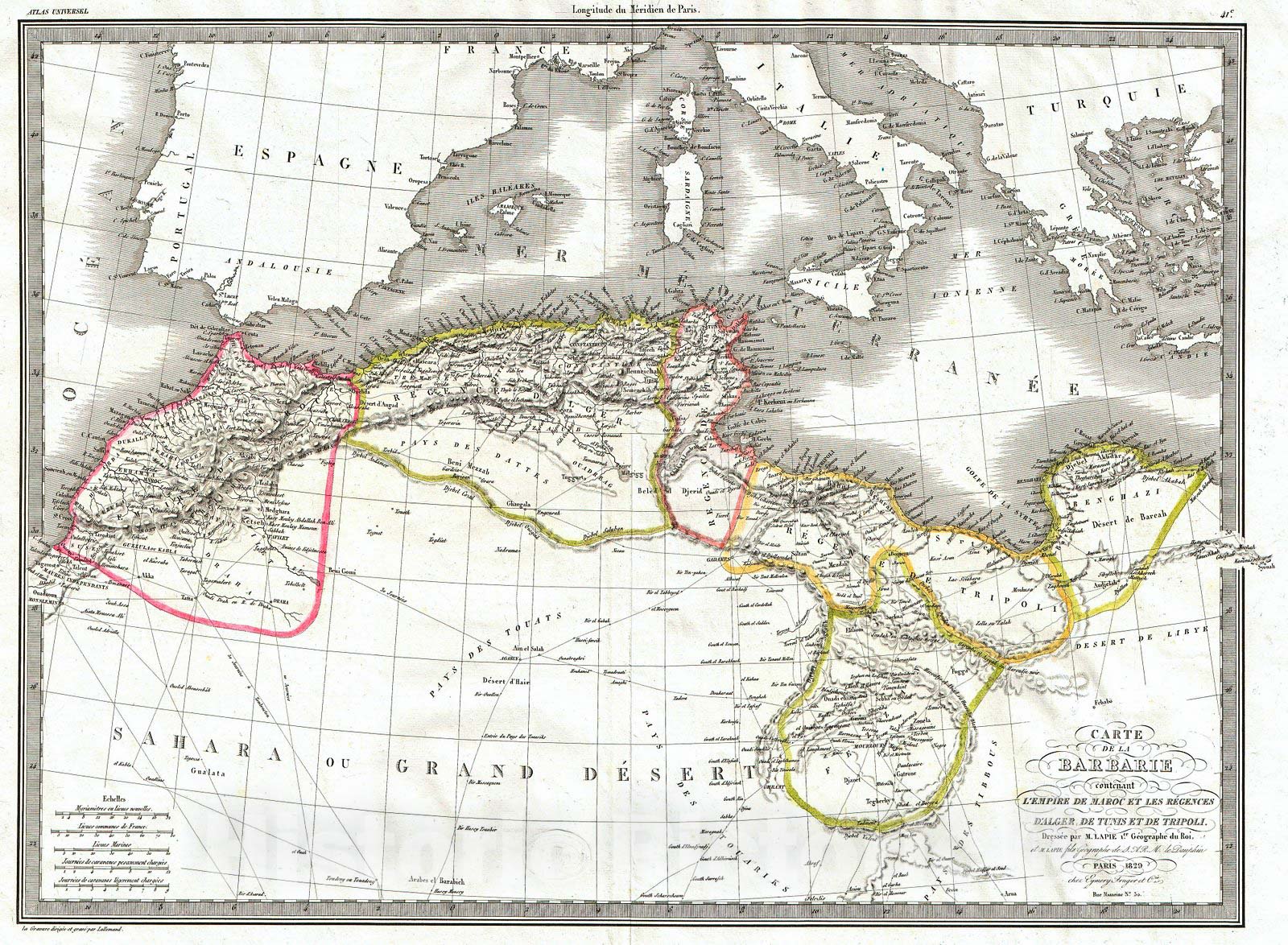 An attractive map 1829 map of Barbary Coast by the French cartographers Pierre and Alexander Lapie. Depicts the western Mediterranean and the northwestern part of Africa from Morocco to Benghazi. Exhibits the typical detail and scientific precision of Lapie maps. Notes caravan routes across the Sahara, topographical features, Oases, and desert Kingdoms. Includes the Kingdoms of Morocco, Tunisia, Alger, Fezzan and Tripoli. Also includes the Balearic Isles and parts of Spain, Italy and Greece. Longitude measured from the Paris meridian. Prepared as plate no. 41 for the 1829 issue of Lapie's Atlas Universel de Geographie Ancienne et Moderne.