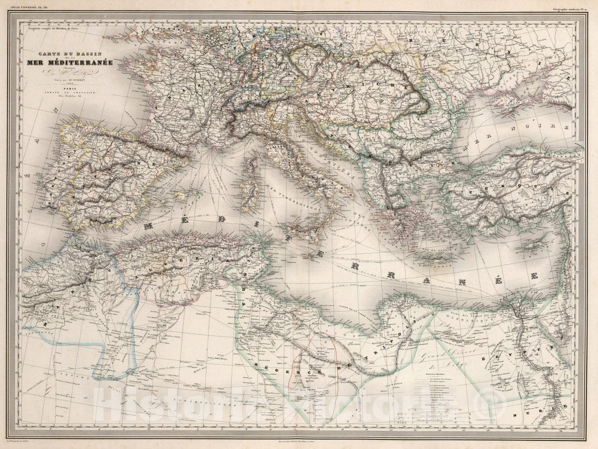 • .Historic Map : Mediterranean Region Carte du Bassin de la Mer Mediterranee. Pl. 30, 1863 Atlas , Vintage Wall Art