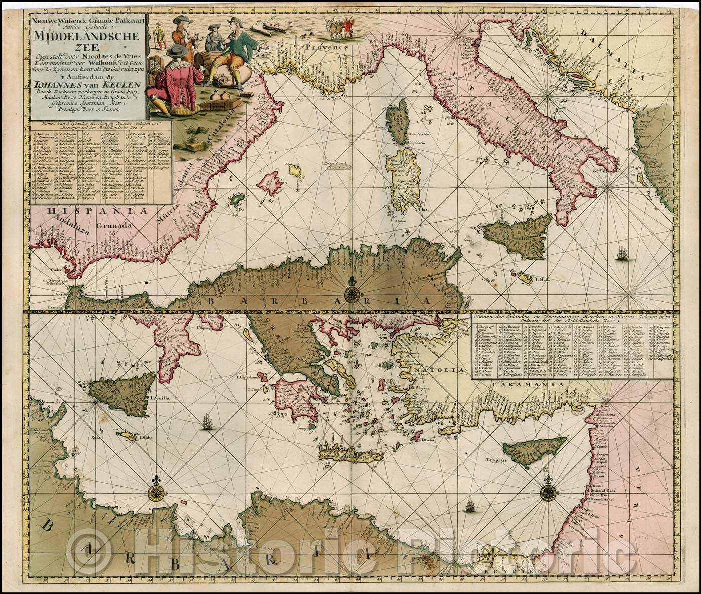 Historic Map - Nieuwe Wassende Graade Paskaart van de Geheele Middelandsche Zee Opgestelt/Van Keulen's Map of the Mediterranean, 1700, Gerard Van Keulen - Vintage Wall Art