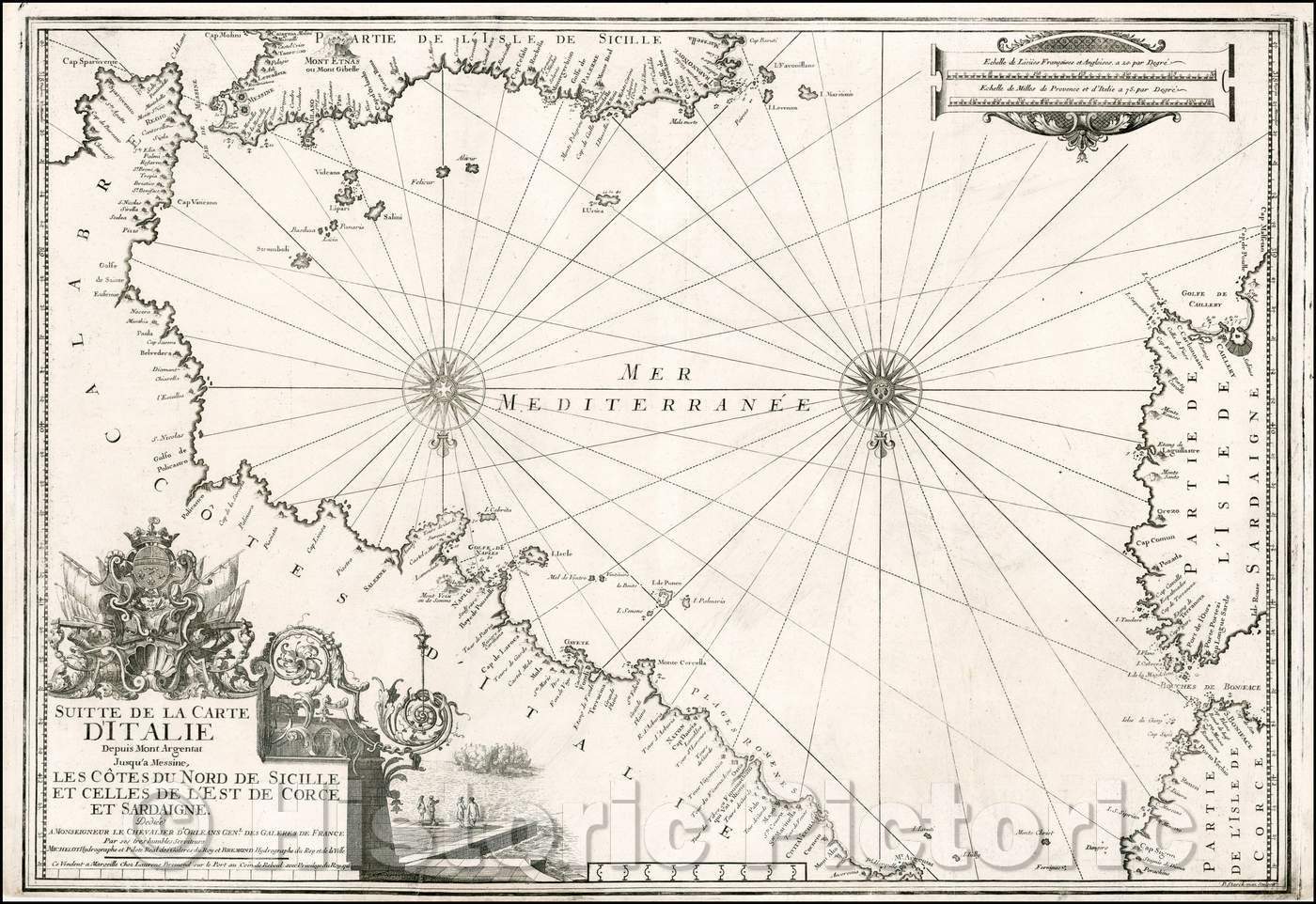 Historic Map - Sutte De La Carte D'Italie Depuis Mont Argentat Jusqu'a Messine/Chart of the Southern Italian Mediterranean coastline, 1718, Laurent Bremond - Vintage Wall Art
