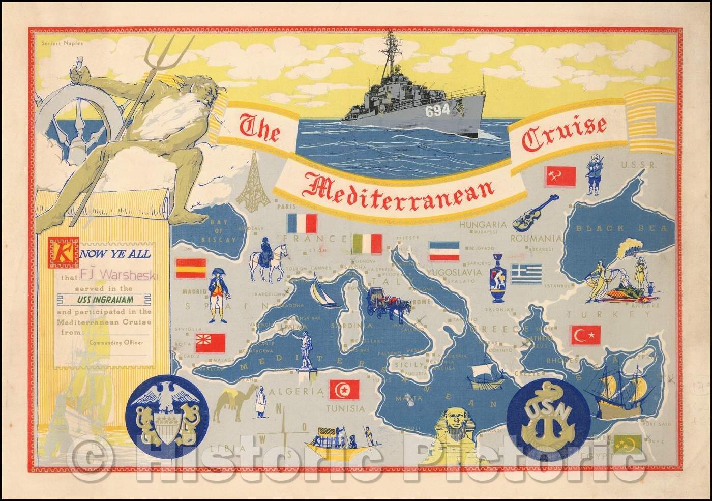 Historic Map - USS Ingraham, The Mediterranean Sea, 1960, Seriart Naples - Vintage Wall Art
