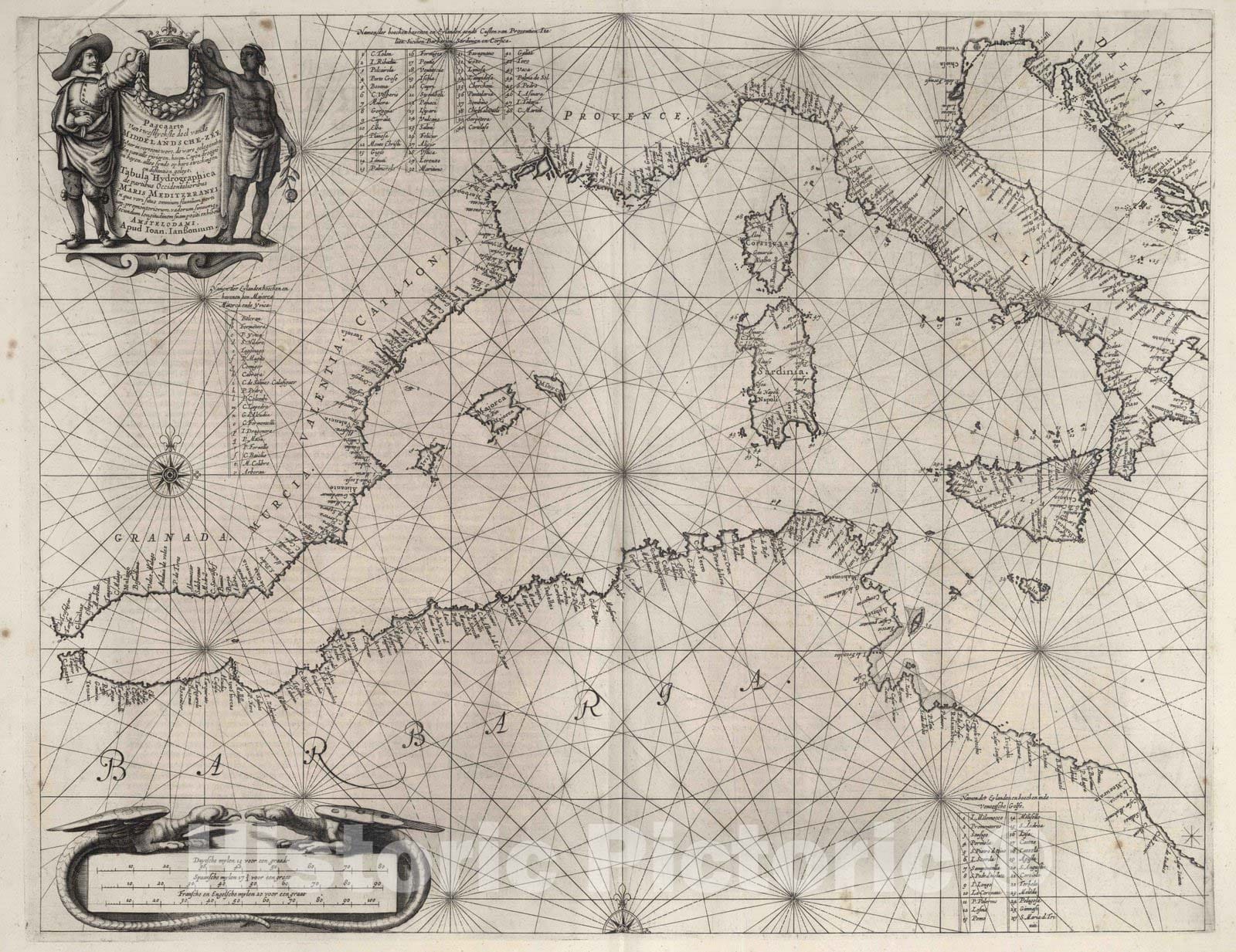 • .Historic Map : Western Mediterranean Sea 1650 Pascaarte Middelandsche Zee, Tabula Hydrographica, Maris Mediterranei. v1 , Vintage Wall Art