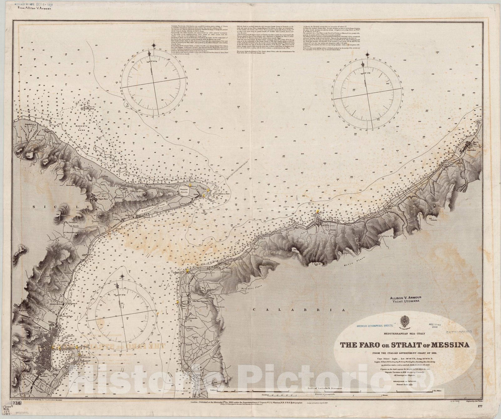 Map : Italy 1907, Mediterranean Sea, Italy, The Faro or Strait of Messina , Antique Vintage Reproduction