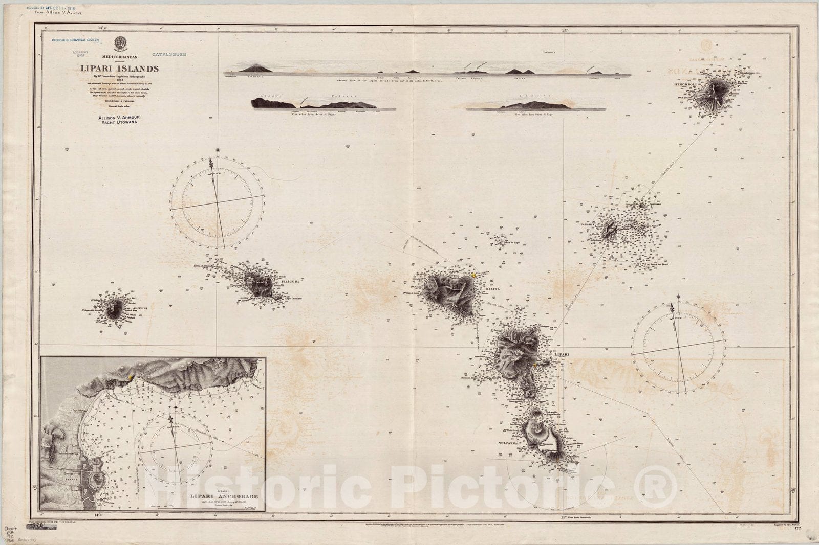 • .Map : Lipari Island, Italy 1908, Mediterranean, Lipari Islands , Antique Vintage Reproduction