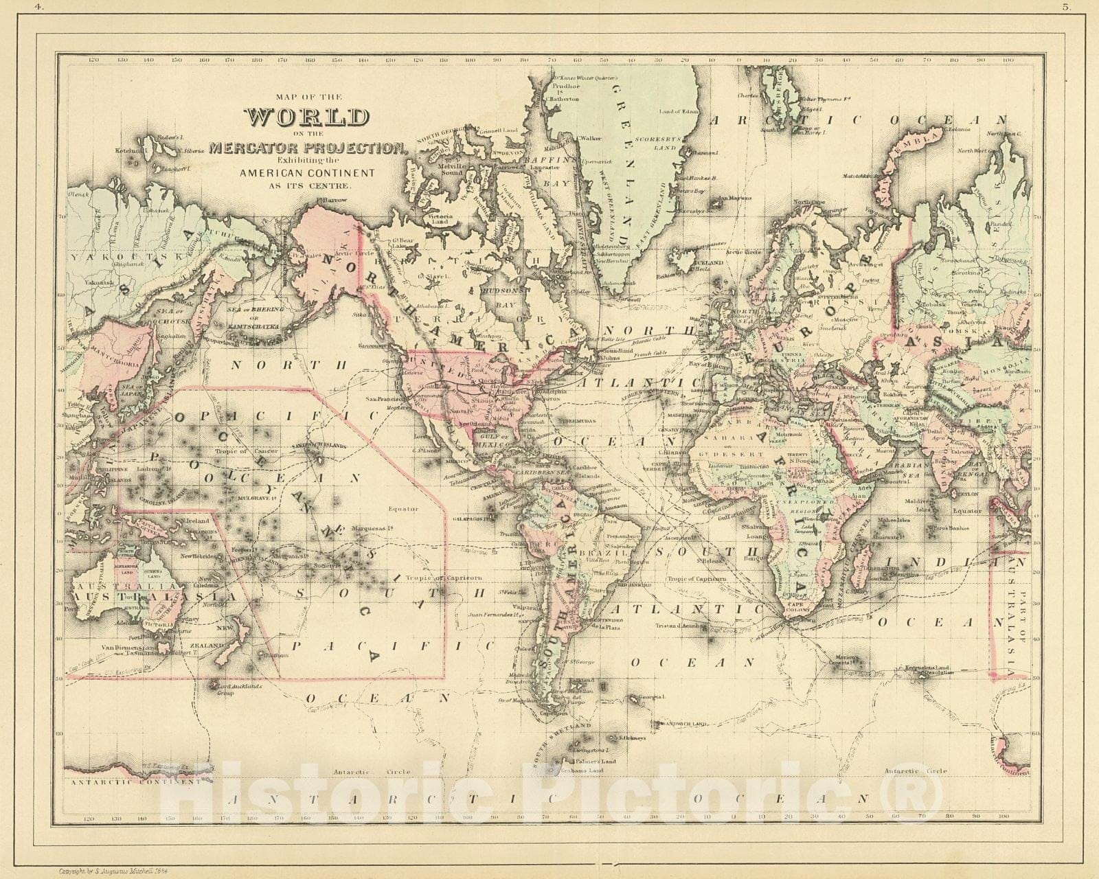 Historic Map : 1886 Map of the World on the Mercator Projection exhibiting the American Continent as it's centre : Vintage Wall Art