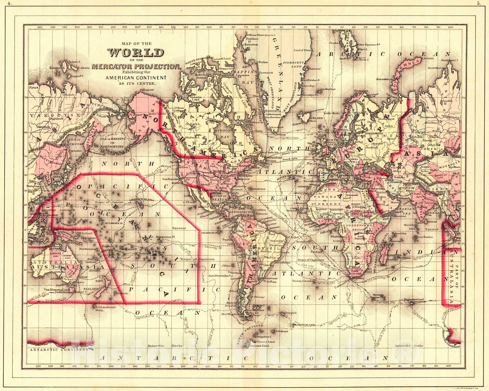 Vintage Map | 1887 Map of the World on the Mercator Projection, Exhibiting the American Continent as its Centre | Mitchell, S. Augustus