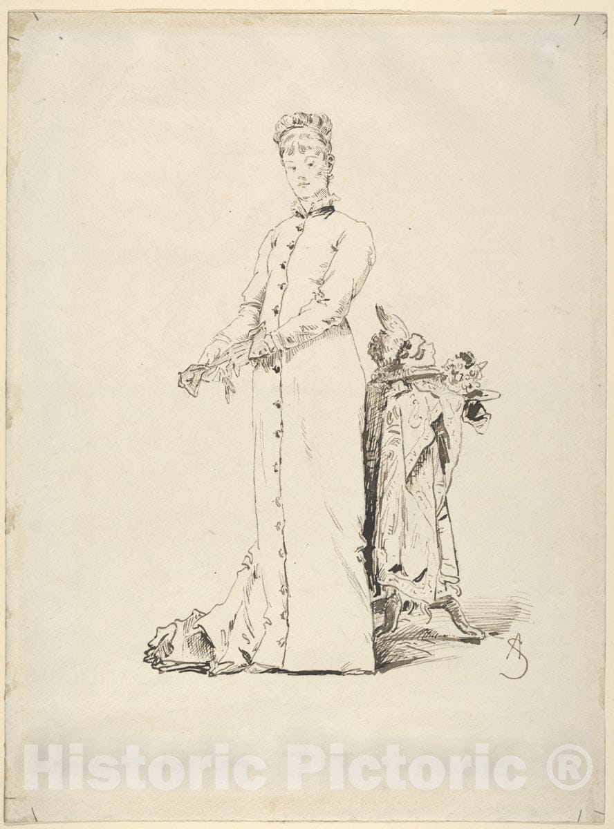 A Standing Young Lady Taking Off Her Gloves - Belgian, Brussels 1823-1906 Paris - Artist Nationality: Belgian - Original Medium, Materials or Technique: Pen and brown ink, over graphite