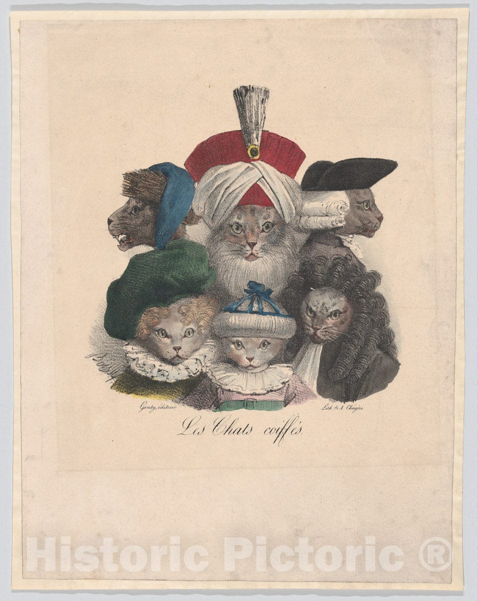 Les Chats Coiffes - French, active ca. 1825-French, active Paris, 1826-French, born Andonville, Loiret, 1770, active until 1830 - Artist Nationality: - Original Medium, Materials or Technique: Lithograph, hand colored