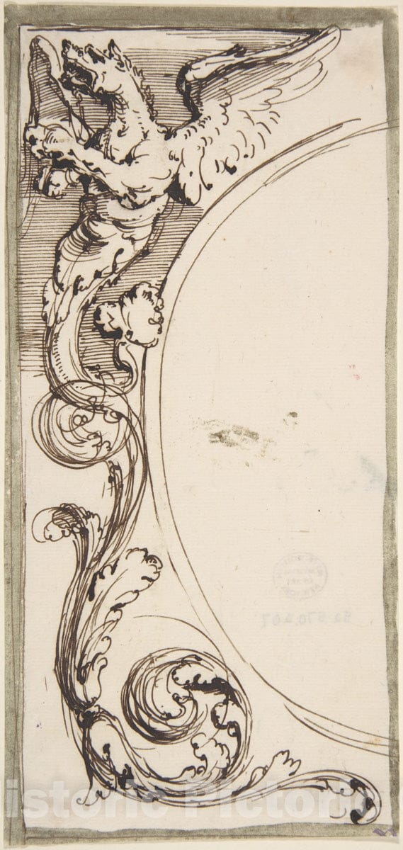 Left Half of a Cartouche with Griffin and Acanthus Scroll - Italian, Bologna 1732-1802 Milan - Artist Nationality: Italian - Original Medium, Materials or Technique: Pen and brown ink, brush and dark green wash