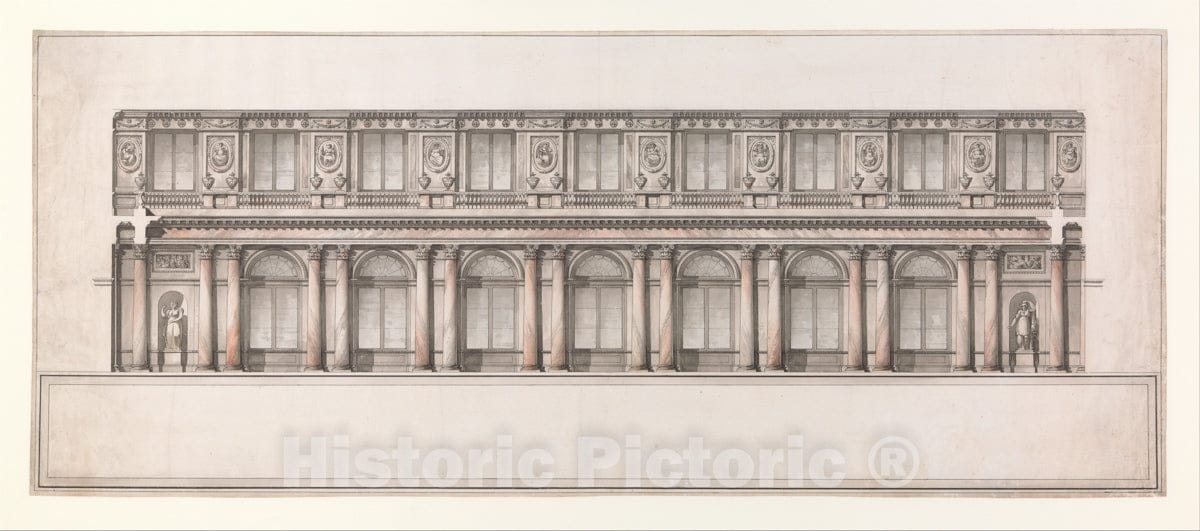 Longitudinal Section of Great Throne Room (Saint George's Hall), Winter Palace, Saint Petersburg - Italian, Rota d'Imagna near Bergamo 1744-1817 Saint Petersburg - Artist Nationality: Italian - Original Medium, Materials or Technique: Pen and gray ink, brush with gray and red wash