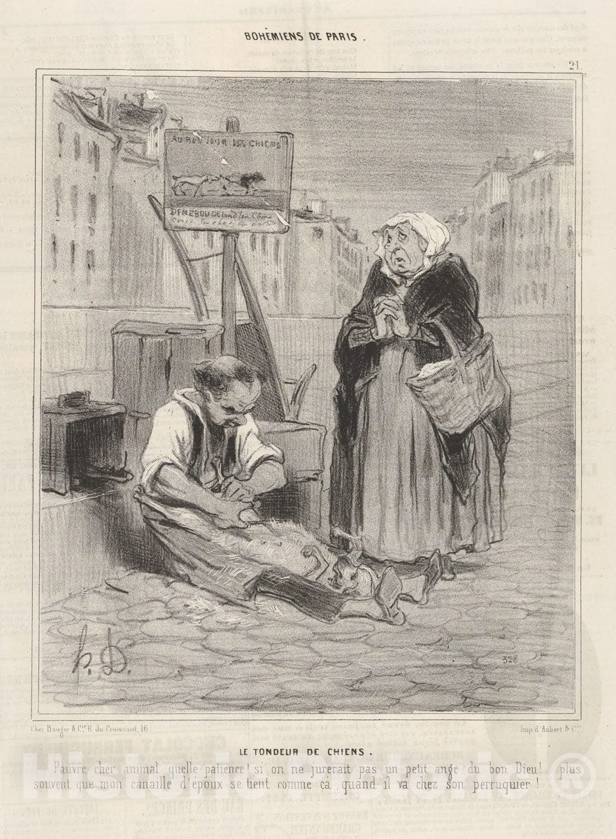 Art Print : Honoré Daumier - Le Tondeur de chiens, Plate 21 from The Series Bohémiens de Paris, published in Le Charivari : Vintage Wall Art