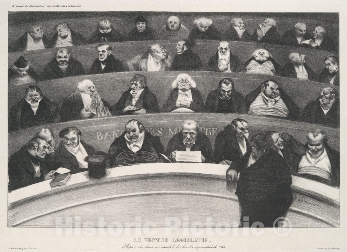 Le ventre legislatif: Aspect des bancs ministeriels de la chambre improstituee de 1834 - French, Marseilles 1808-1879 Valmondois - Artist Nationality: French-French - Original Medium, Materials or Technique: Lithograph