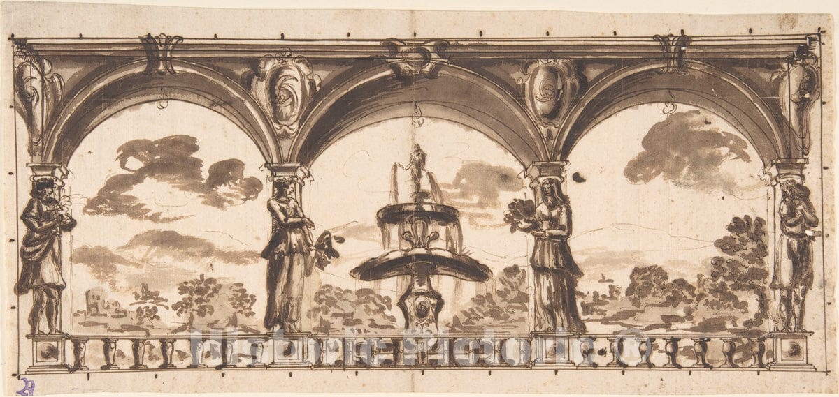 Art Print : Italian, Roman-Bolognese, 17th Century - Loggia with Caryatids Before a Fountain and Landscape : Vintage Wall Art
