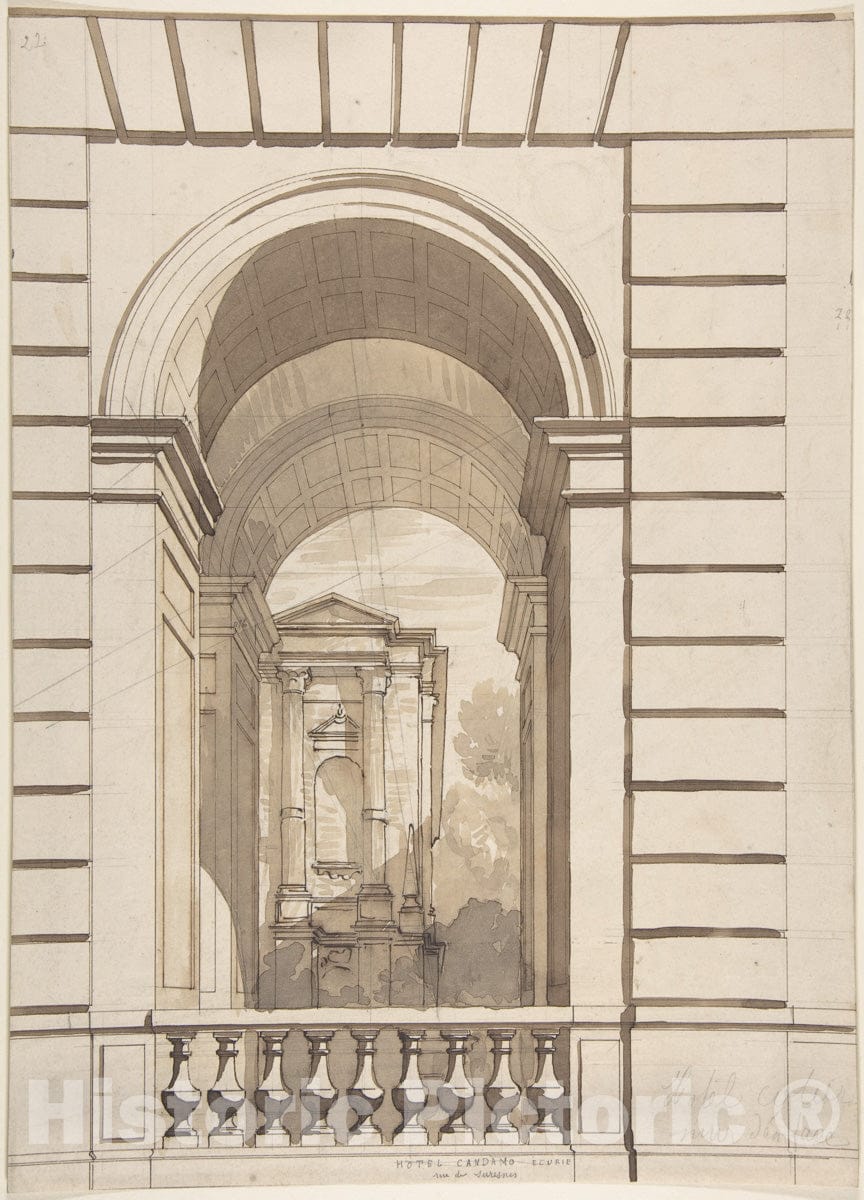 Design for Stable Arches, Htel Candamo - French, died 1897-French, born Paris, 1820 - Artist Nationality: French-French - Original Medium, Materials or Technique: Pen and black ink, watercolor