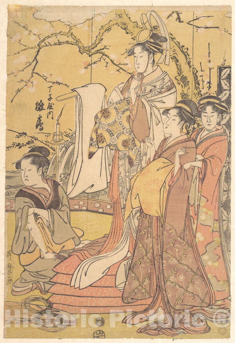 Art Print : Kitagawa Utamaro - The Oiran Hinazuru of Chojiya Standing Upon a Pile of Futon - Japan : Vintage Wall Art