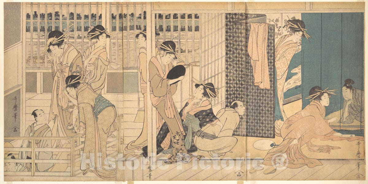 Scene in the Yoshiwara - Japanese, ca. 1754-1806 - Artist Nationality: Japanese - Original Medium, Materials or Technique: Triptych of polychrome woodblock prints; ink and color on paper
