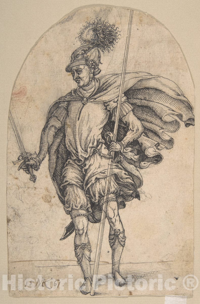 A Standing Soldier - active ca. 1552-ca. 1570 - Artist Nationality: German - Original Medium, Materials or Technique: Pen and black ink, over a sketch in black chalk, red chalk