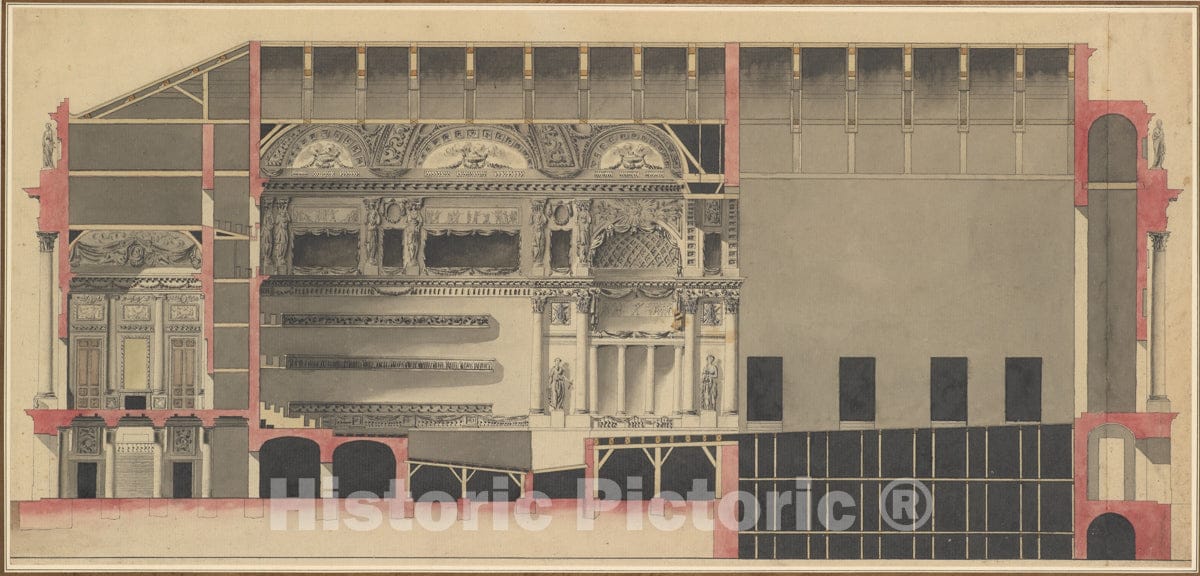 Longitudinal Section of a Theatre - 1713-1796 - Artist Nationality: - Original Medium, Materials or Technique: Pen and black and gray ink, brush and gray, black, rose, and yellow wash