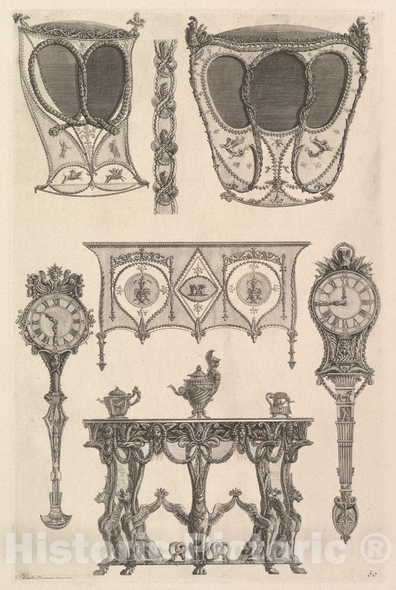 Art Print : A Sedan Chair, a Coach, a Commode, a Side Table and Two Clocks - Artist: Giovanni Battista Piranesi - Created: c1769 : Vintage Wall Art