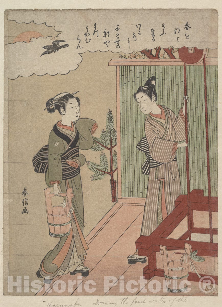Art Print : Suzuki Harunobu - Drawing The First Water of The New Year - Japan : Vintage Wall Art