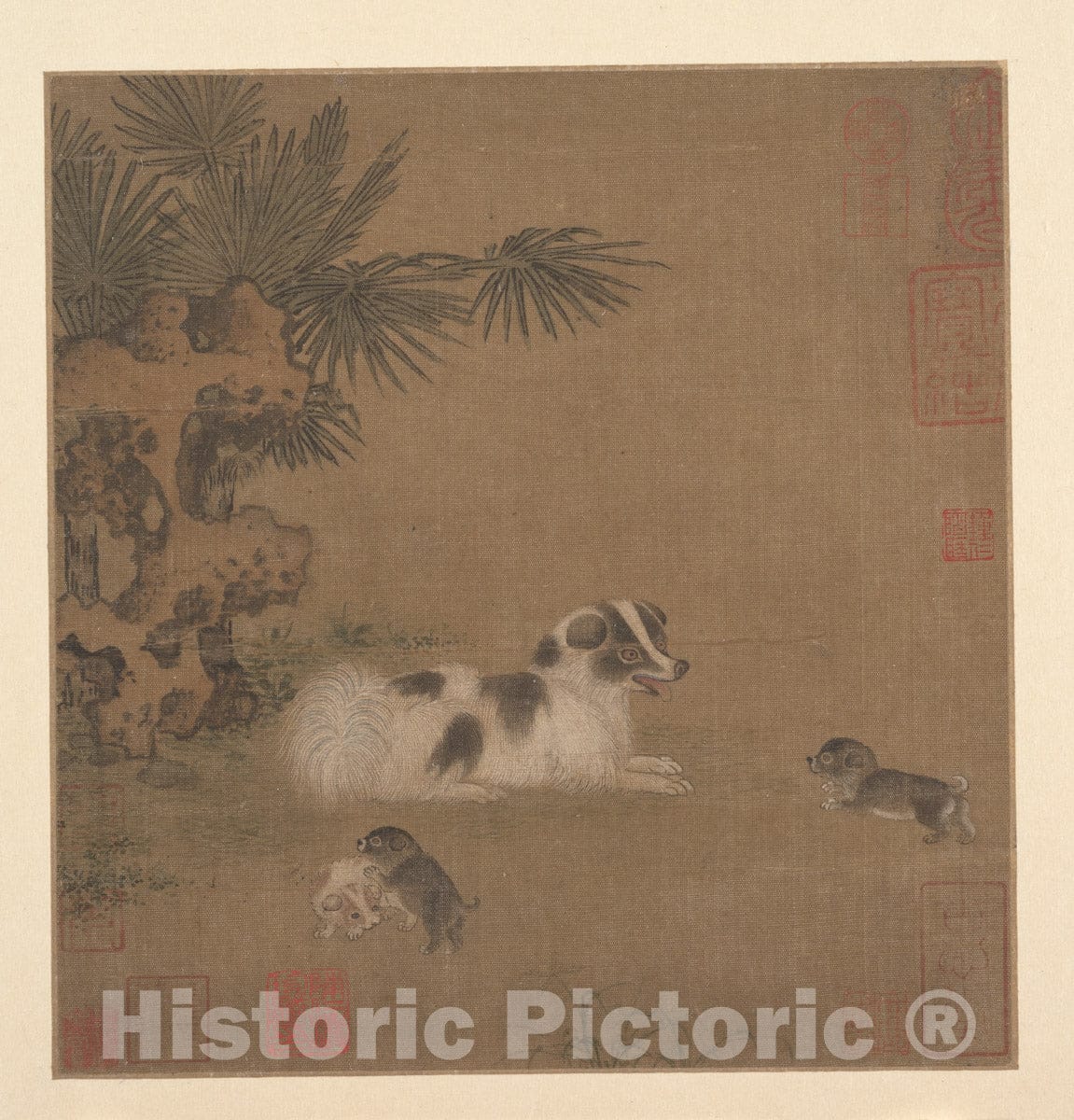 Art Print : Unidentified Artist - Puppies Playing Beside a Palm Tree and Garden Rock - China - Ming Dynasty (1368–1644) : Vintage Wall Art