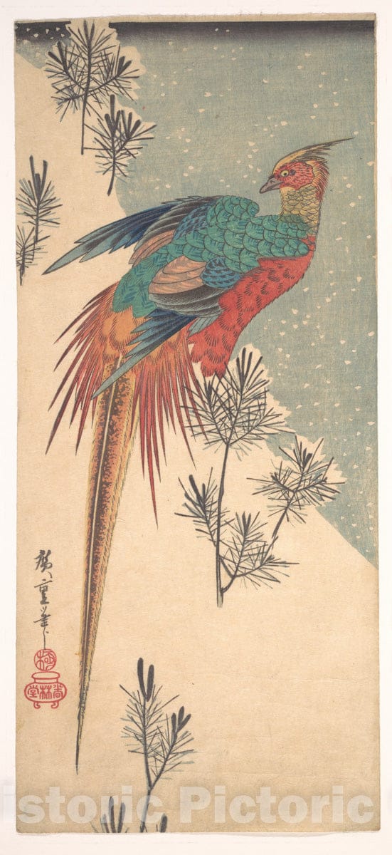 Art Print : Utagawa Hiroshige - Golden Pheasant and Pine Shoots in Snow - Japan : Vintage Wall Art