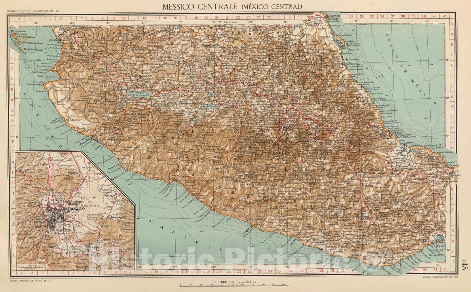 Historic Map : Mexico, Mexico City Region (Mexico) 1929 148. Messico Centrale. , Vintage Wall Art