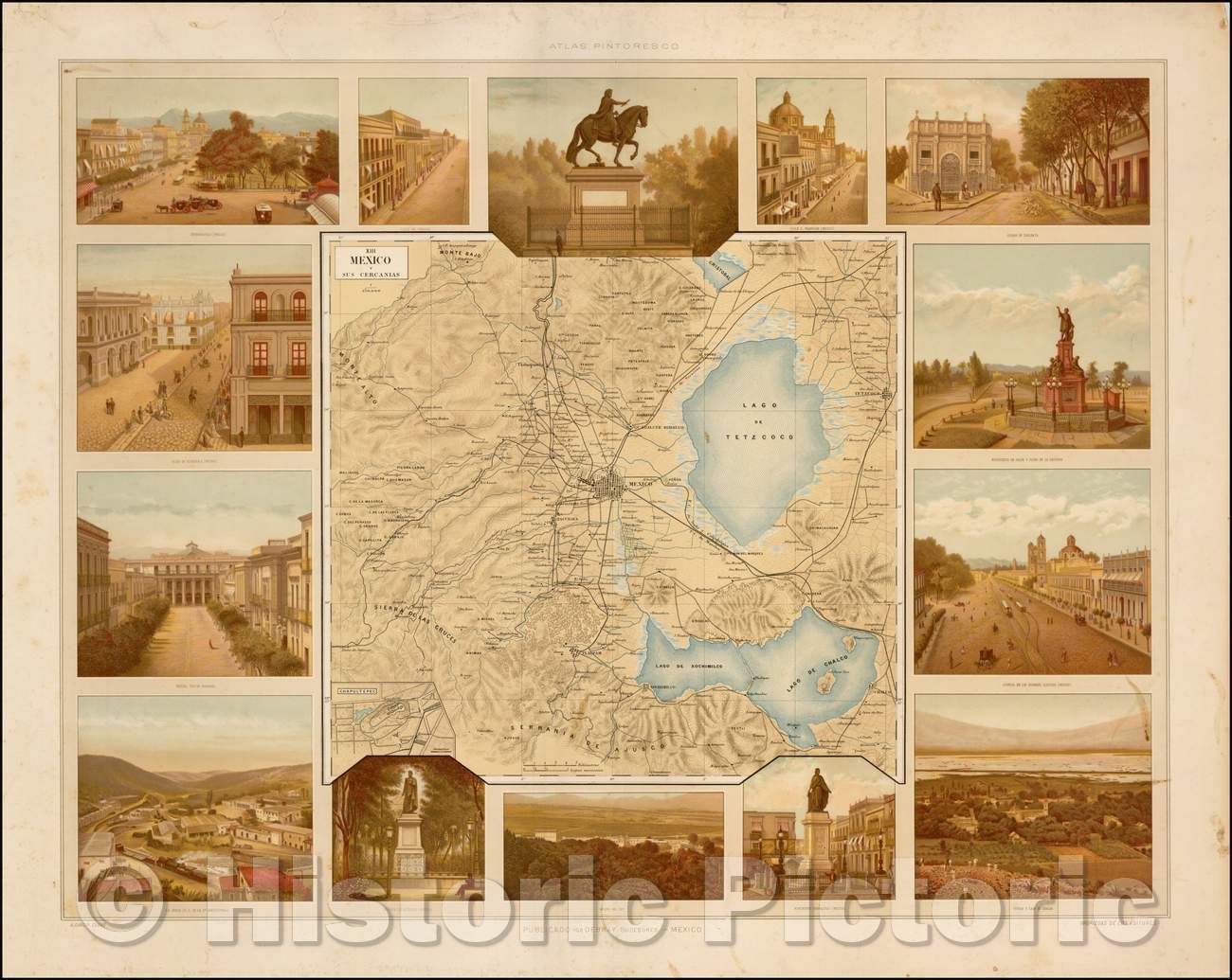 Historic Map - XIII Mexico y Sus Cer/Map of the environs of Mexico City, surrounded by vignettes of important Views in and around Mexico City, 1885 - Vintage Wall Art
